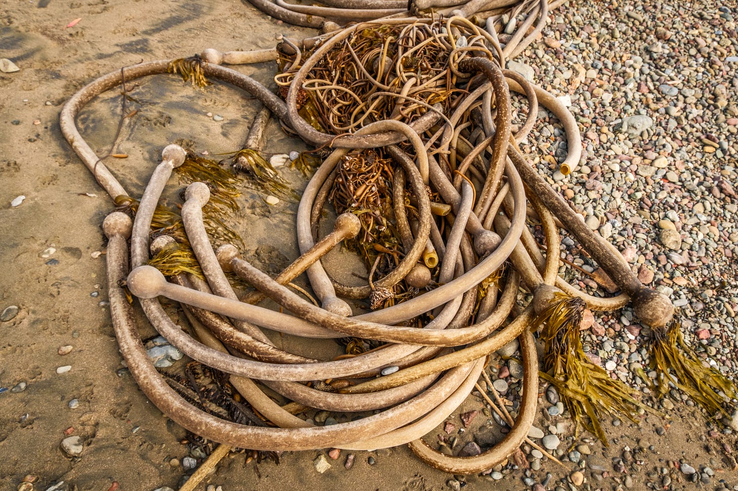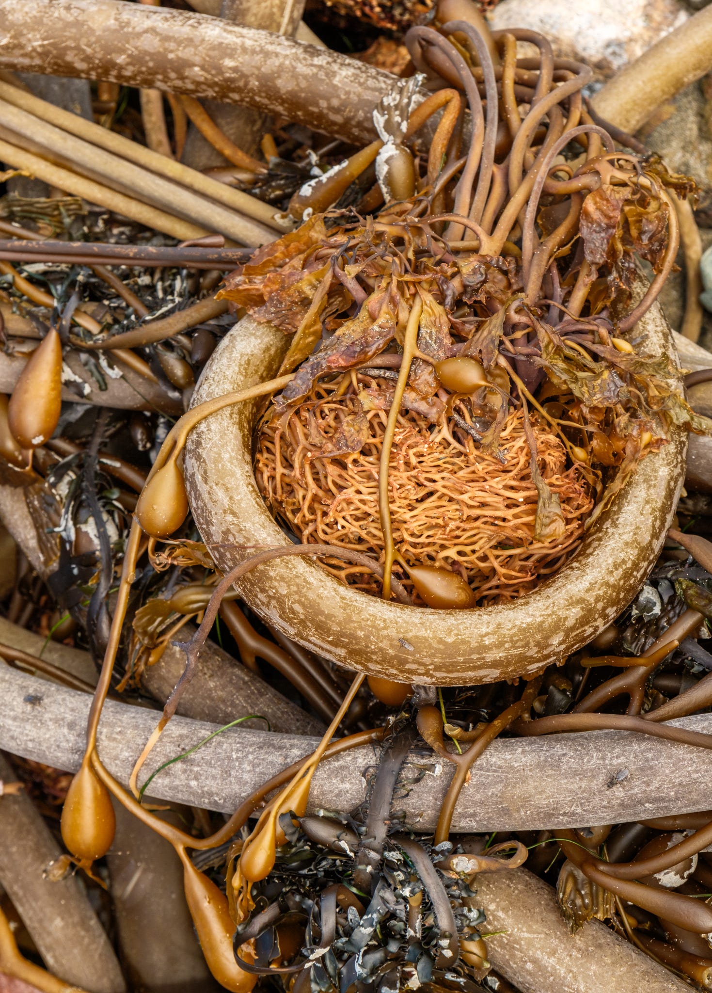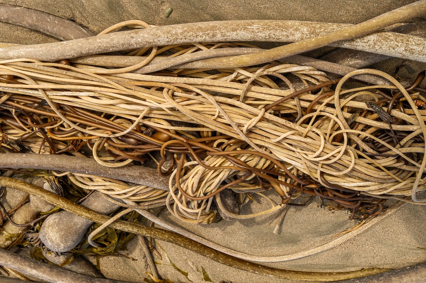 As my family hiked on, I stopped to soak up the scene - endless variations of plant entanglements - root balls looking like bird nests, bull kelp ropes wrapped into bowls around leafy greens, the long “whips” wrapped around barnacles, stretched and tied by surf action.