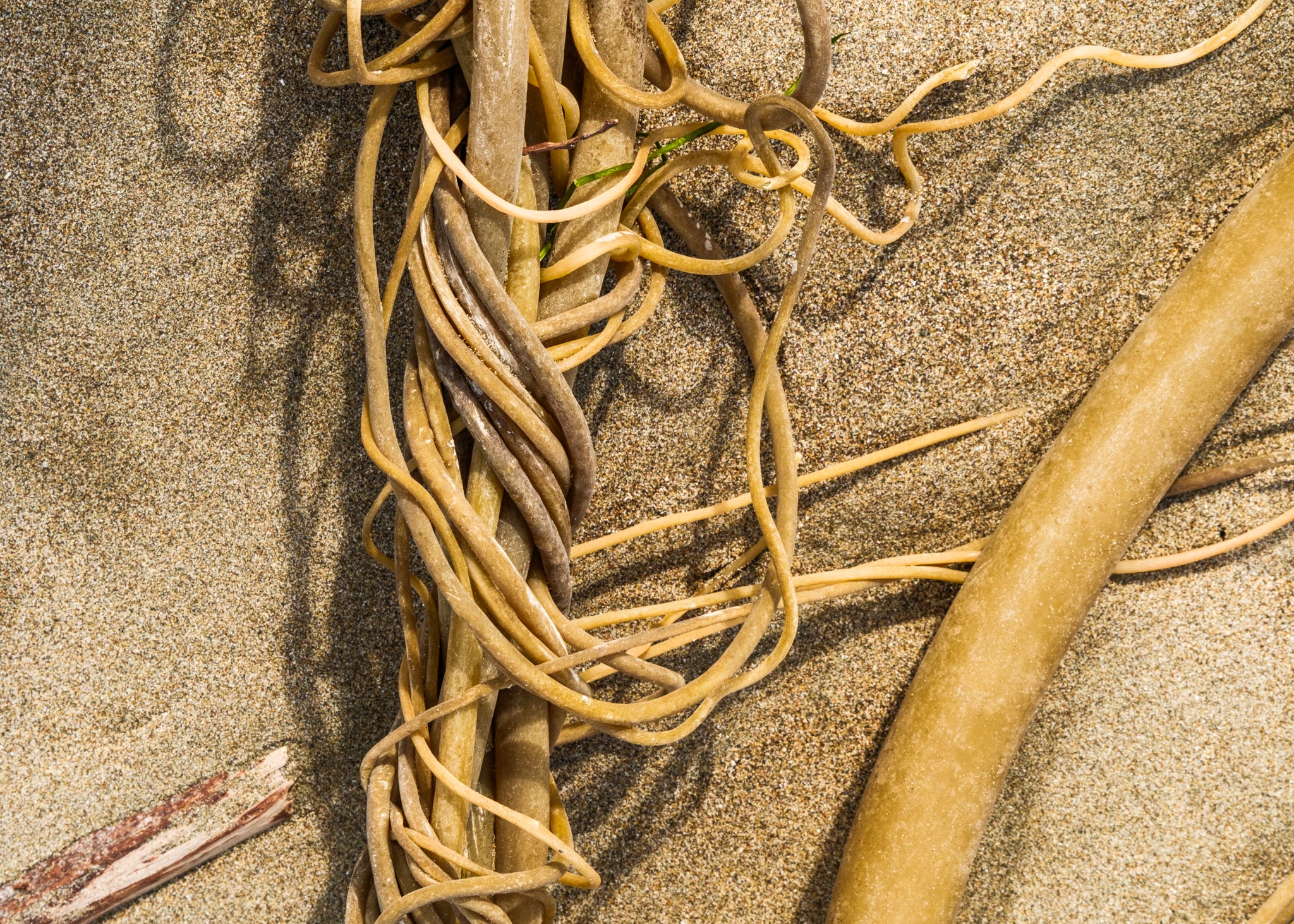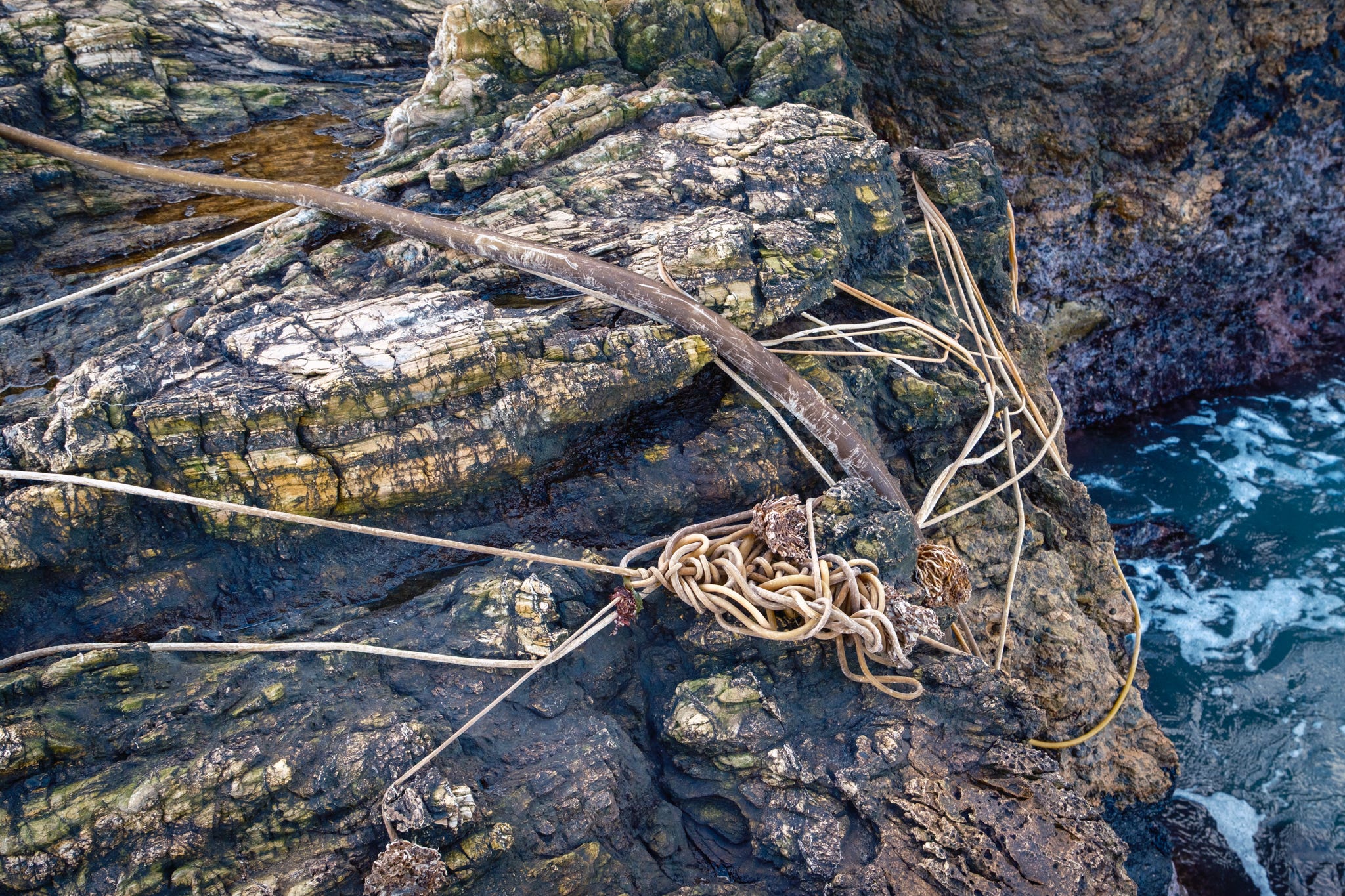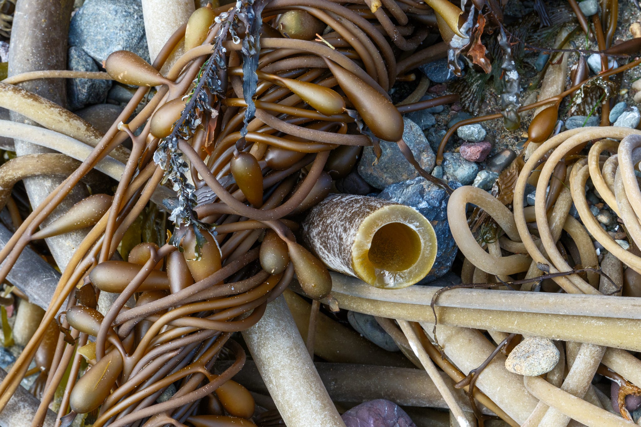 As my family hiked on, I stopped to soak up the scene - endless variations of plant entanglements - root balls looking like bird nests, bull kelp ropes wrapped into bowls around leafy greens, the long “whips” wrapped around barnacles, stretched and tied by surf action.