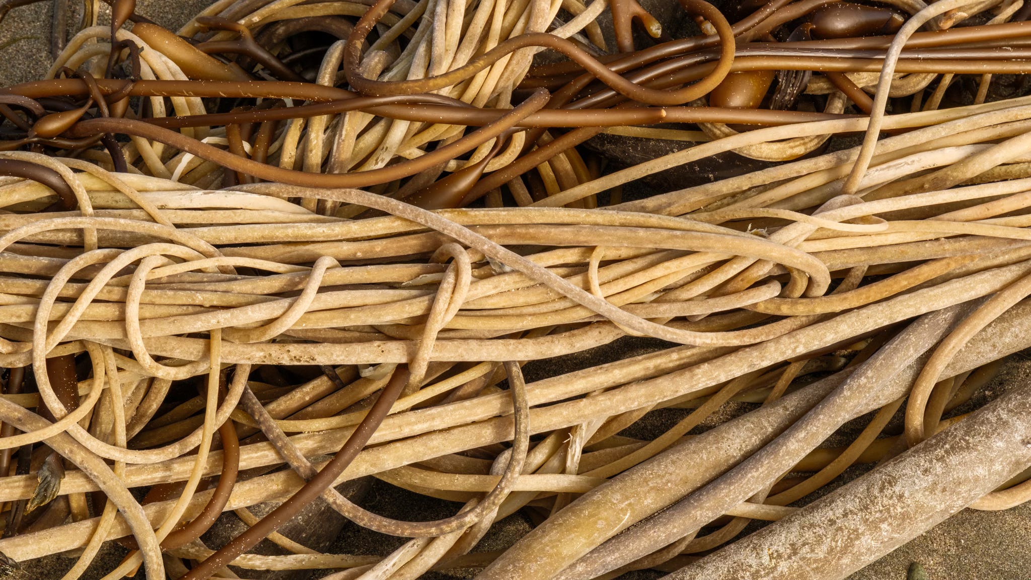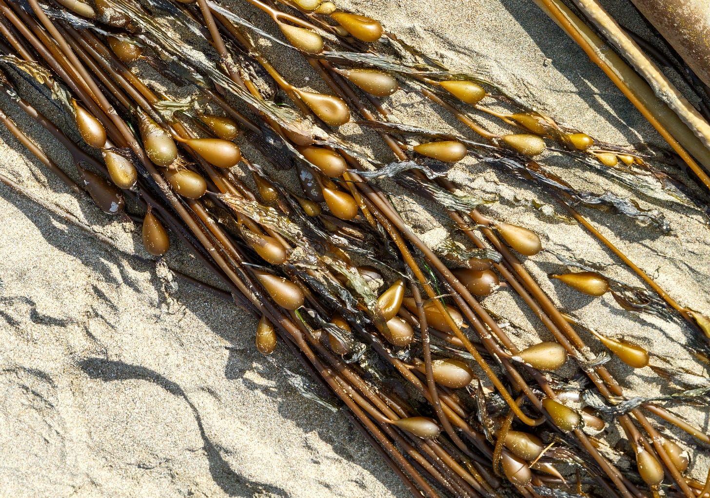 After an atmospheric river had its way with the coastline, the beach at San Simeon was decorated in large piles of tangled giant and bull kelp.